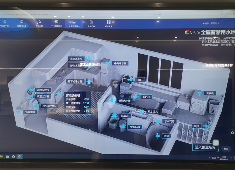 分质供水大数据中心可准确监测服务对象家中自来水和直饮水的浊度、PH值、余氯和电导率等数值,并据此提供用户建议的饮水量和合适的温度。它能对设备运行状况、滤芯寿命、故障、漏损进行监测,实时记录用户的滤芯更换、维修、清洗记录,为用户建档;还可对水压水量远程抄表,用户可用专属APP对设备进行开关机,并及时获取每日用电量、滤芯状态,24小时水质走势、统计净水量等数据,帮助用户实现智慧用水。