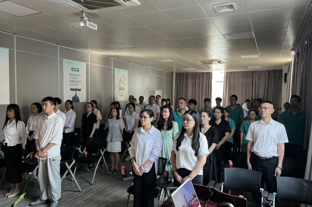 9时整,纪念大会正式开始。全体员工起立高唱国歌,注视着屏幕中天安门广场上冉冉升起的五星红旗,深切缅怀为民族独立和人民解放英勇献身的革命先烈。